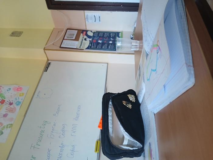 The image depicts the interior of a classroom in Cherven Bryag, Bulgaria, viewed from a student's desk. In the foreground, a light brown wooden desk holds an open black pencil case with two golden decorative elements, a stack of papers including one open notebook displaying a colored diagram, and a clear plastic cup containing water. The background features a large white magnetic whiteboard with text written in blue marker, including "Frauentag" (German for Women's Day) and a list of Bulgarian cities/locations such as "Бургас" (Burgas), "Варна" (Varna), "София" (Sofia), and "ГКПП Калотина" (Kalotina Border Checkpoint). Above the whiteboard, a poster with colorful handprints is affixed. To the right of the whiteboard, a cream-colored wall displays a small bulletin board with papers, and below it, a poster with blue graphics and the Cyrillic text "Ученикът на 21 век" (The Student of the 21st Century). A brown door frame is partially visible on the far right, and a square ventilation grate is present on the upper right wall. No individuals are present in the scene.