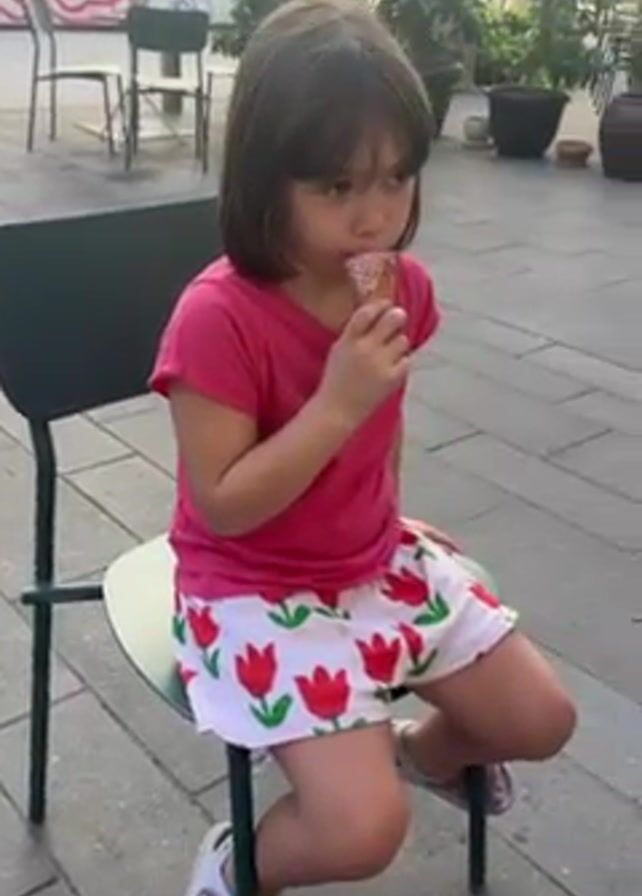 A little girl is sitting on a small chair outside while enjoying an ice cream cone. She is wearing a pink shirt, a white skirt with red tulip designs, and sandals. Nearby is a table where another young girl is sitting, flashing a hand gesture towards the camera. She is wearing a striped shirt and has a cup of coffee and a phone on the table in front of her. The scene takes place outdoors on a stone-paved area, possibly a patio of a café, with potted plants, chairs, and tables in the background.