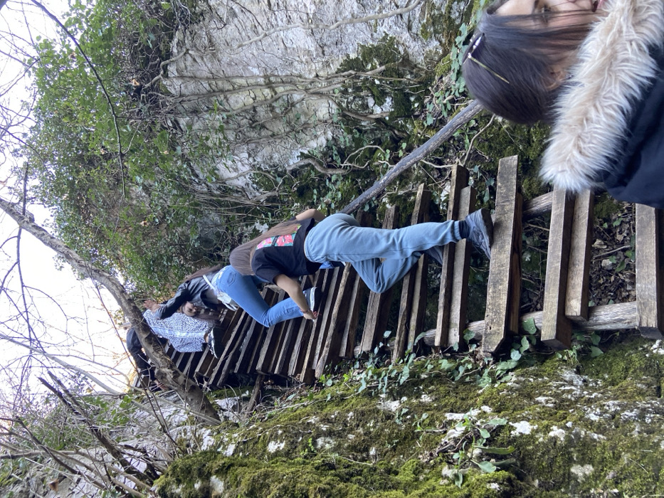 The image captures a group of individuals ascending a steep, rustic wooden staircase cut into a natural rock and heavily vegetated incline in Hotnitsa, Bulgaria