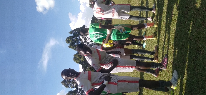 A line of soccer players stands on a green field under a partly cloudy blue sky