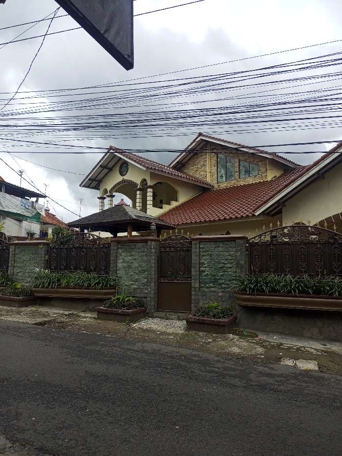 A house with a red-tiled roof and stone accents behind a fence composed of stone pillars and wrought iron. Green plants sit in planters at the base of the fence. A small gazebo sits on the property to the left of the house. Electrical wires crisscross in the sky above the house under an overcast sky. A dark road in the foreground.