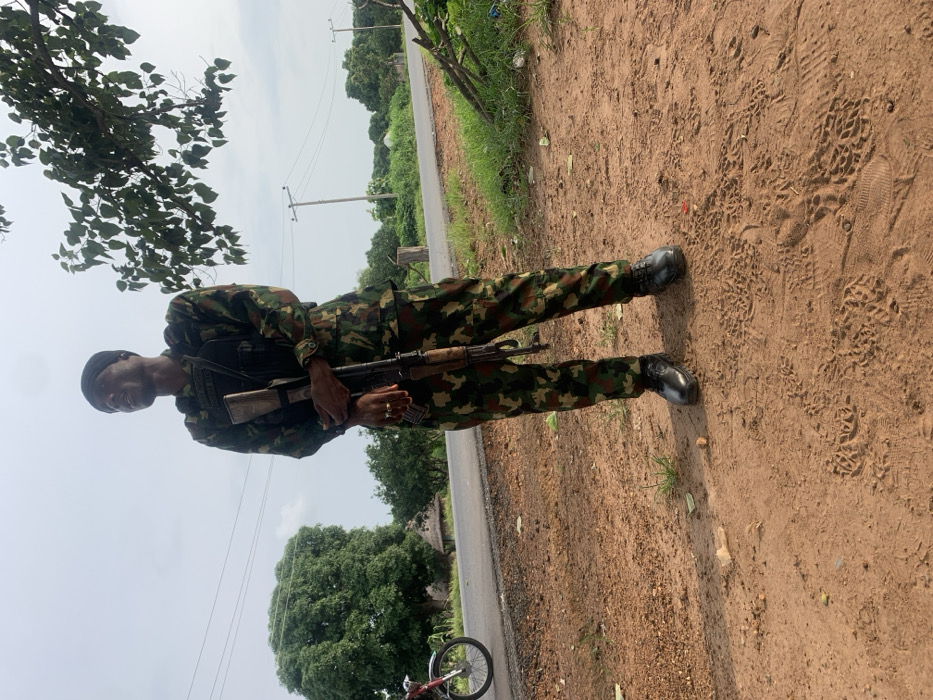 A single male individual, appearing to be an adult, stands outdoors in Zaki Biam, Nigeria, under a bright, overcast sky