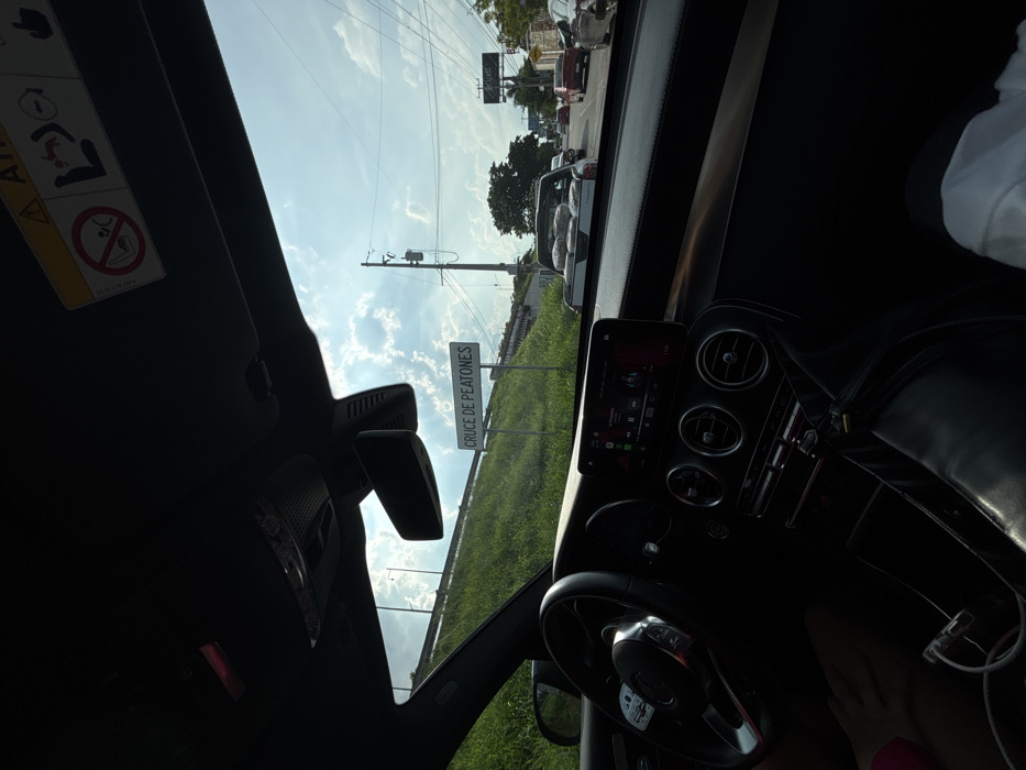- "The image captures a forward-facing view from inside a modern, dark-paneled passenger vehicle, likely on a sunny, partly cloudy day in Mérida, Mexico" by FM-mwT292, licensed under CC BY 4.0