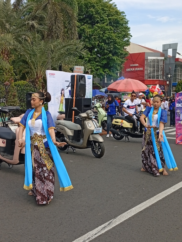 Two barefoot women perform a traditional Indonesian dance on a paved road. They wear ornate headpieces, white tops with blue sleeves, gold sashes, and brown batik skirts. A light blue sash drapes over their arms. Scooters are parked behind them, along with a Yamaha banner and a speaker. People watch the performance, some on scooters. A red and white building is visible in the background under a cloudy sky. Trees and a fence line the street.