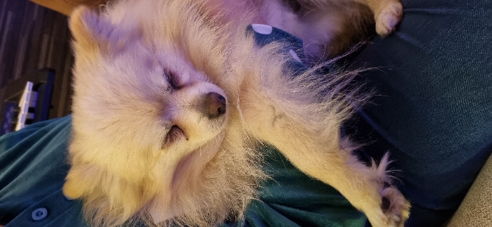 - "A small, light-furred dog with closed eyes, likely a Pomeranian, rests on a person's lap" by FM-rGZrc2, licensed under CC BY 4.0