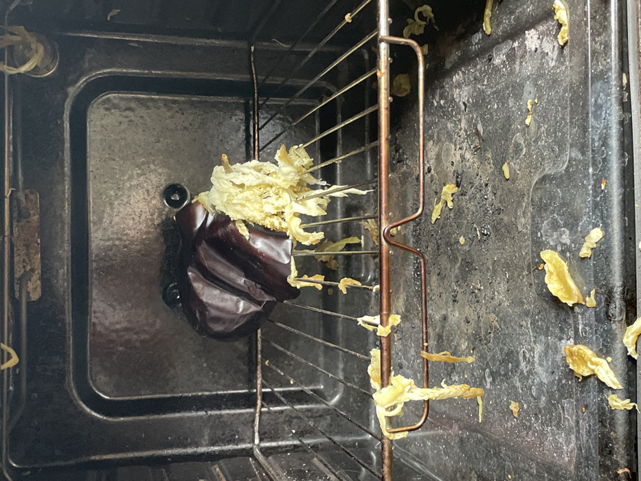 An eggplant sits on an oven rack, adorned with a scattering of shredded, yellowish food resembling cabbage. The oven interior is dirty and stained, with splatters and baked-on residue visible on the side walls and floor. The oven rack itself also has remnants of the same shredded food clinging to its surface. The scene suggests a cooking mishap or leftover food that has not been cleaned.