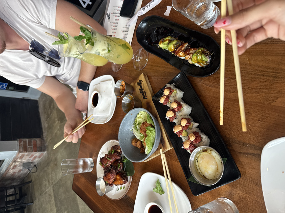 The image depicts a dining scene at a "Pokebelly Sushi" restaurant in Miami, Florida