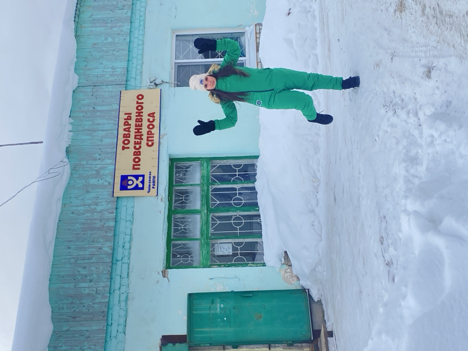 A woman in a green snowsuit poses in front of a weathered, light blue building. The building features a sign with Russian text and a blue logo, along with two windows framed in green. Deep snowdrifts line the building's base, reaching up to the lower window. The woman wears a white hat and black mittens, standing with her arms raised and legs slightly apart. The background is a snowy landscape under a bright sky.