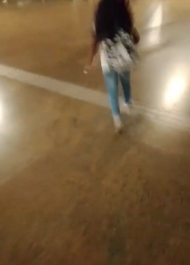 back of a young child running on a polished, tan-colored floor with white stripes, possibly a subway platform. The child has dark, curly hair and wears light blue jeans and a patterned shirt. In the same direction, a taller woman with long dark hair and wearing a yellow shirt, blue jeans, and a light pink backpack walks behind the child. She then catches up to the child, grabs their hand, and they continue walking together. In the background, there are metal railings and other people walking. The lighting is moderate with some bright spots.