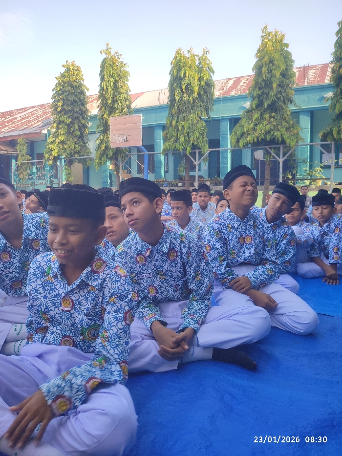 A group of young boys, possibly students, are sitting on a blue tarp outside. They are wearing similar blue and white patterned shirts and black caps. The boys are of varying ages and have different expressions on their faces, ranging from smiling to pensive. Tall green trees and a light blue building can be seen in the background. The date "23/01/2026 08:30" is printed on the bottom right.