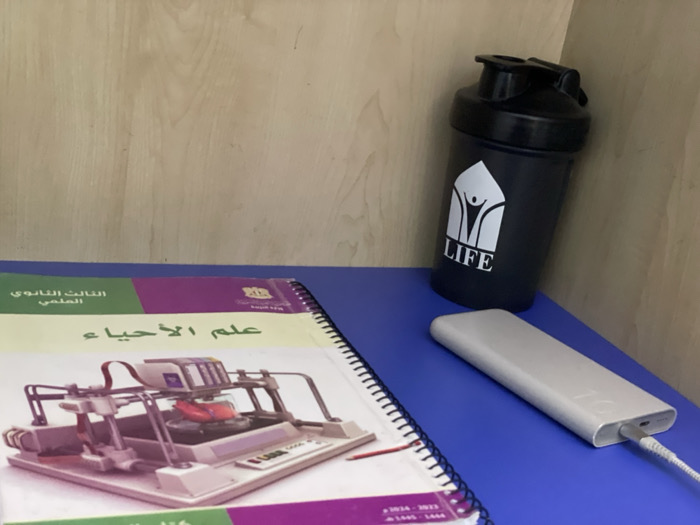 The image displays an indoor scene on a blue tabletop within Al-Qanawat Municipality, Syria. On the left, a spiral-bound textbook titled "علم الأحياء" (Biology) for "الثالث الثانوي العلمي" (Third Scientific Secondary/12th Grade Science), marked 2023-2024 (1445-1444 Hijri) and bearing the Ministry of Education logo, rests with an illustration of a scientific apparatus on its cover. To the right, a black shaker bottle with a white "LIFE" logo is positioned upright. A silver/light gray rectangular power bank, connected by a white cable from its right end, lies on the table to the right of the textbook. The background consists of a light-colored wooden surface. No individuals are present.