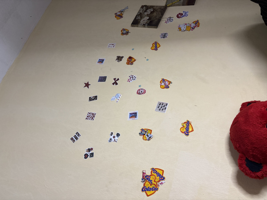 The image displays an interior room, specifically a wall painted in a light, creamy yellow or beige hue, extending to a white or off-white ceiling at the top. The wall is sparsely adorned with numerous small stickers and prints arranged in an irregular pattern. **Subjects/Objects on the Wall:** * Multiple "Cola Cao" brand stickers are visible, predominantly heart-shaped with yellow and red coloring. Two larger ones are located on the far left, and several smaller ones are scattered towards the right. * Other stickers include: a solid red star; a brown bow-tie shape; a white rabbit figure; a sticker with "ALL GIRL" text; small square prints depicting what appear to be eyelashes or individual portraits; and various other small, abstract, or cartoon character decals (e.g., Hello Kitty elements on the far right). * On the far right side, a rectangular piece of wall art or a framed picture is visible, featuring a dark background with light, abstract patterns resembling flowers or clouds. A string of beads or decorative chain hangs below it. **Subjects/Objects on the Floor/Foreground:** * In the lower left corner, the top portion of a large, plush red teddy bear with black ears is partially visible, suggesting it is positioned on a surface beneath the wall. **Actions/Interactions:** * No people or discernible actions or interactions are present in the image. **Environment/Location:** * The setting is an indoor residential or private space. The specific location within the city of Jos, Nigeria, cannot be determined from the visual evidence provided in the image. The lighting appears dim, suggesting artificial illumination or indirect natural light.