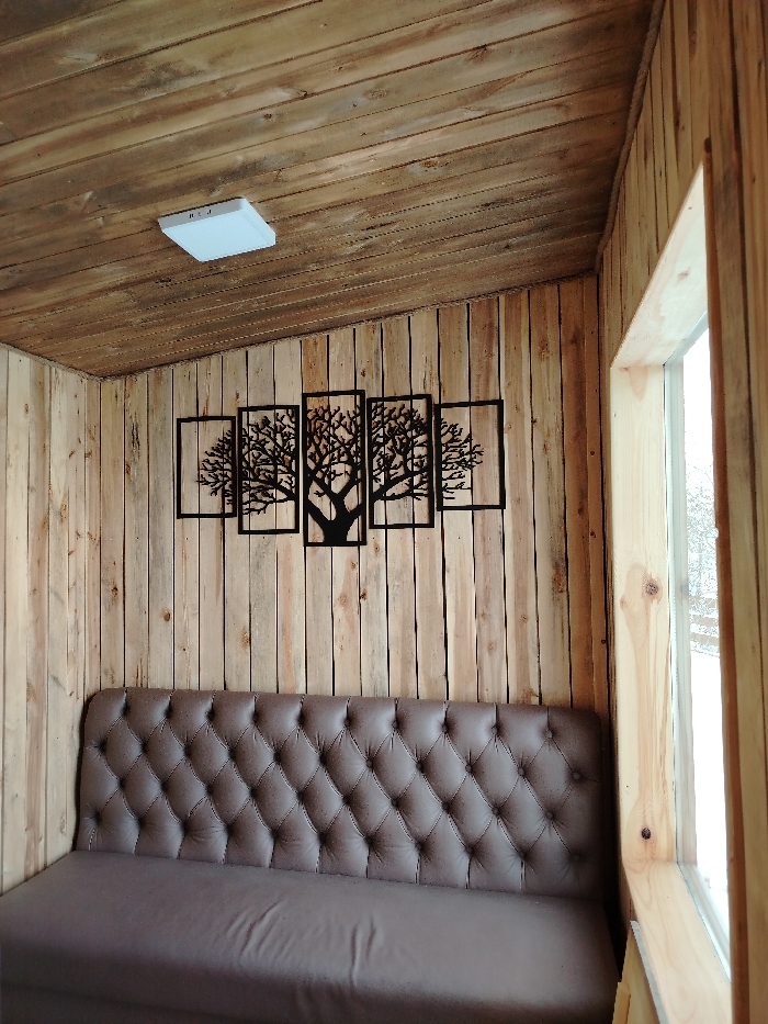 A cozy nook features a built-in sofa with a dark brown tufted back and a smooth, flat seat. The surrounding walls and angled ceiling are clad in natural, unpainted wood planks. Above the sofa, five rectangular metal panels depict a stylized tree silhouette. A modern, square light fixture illuminates the ceiling. A window with light-colored wood trim is on the right. The atmosphere is rustic and inviting.