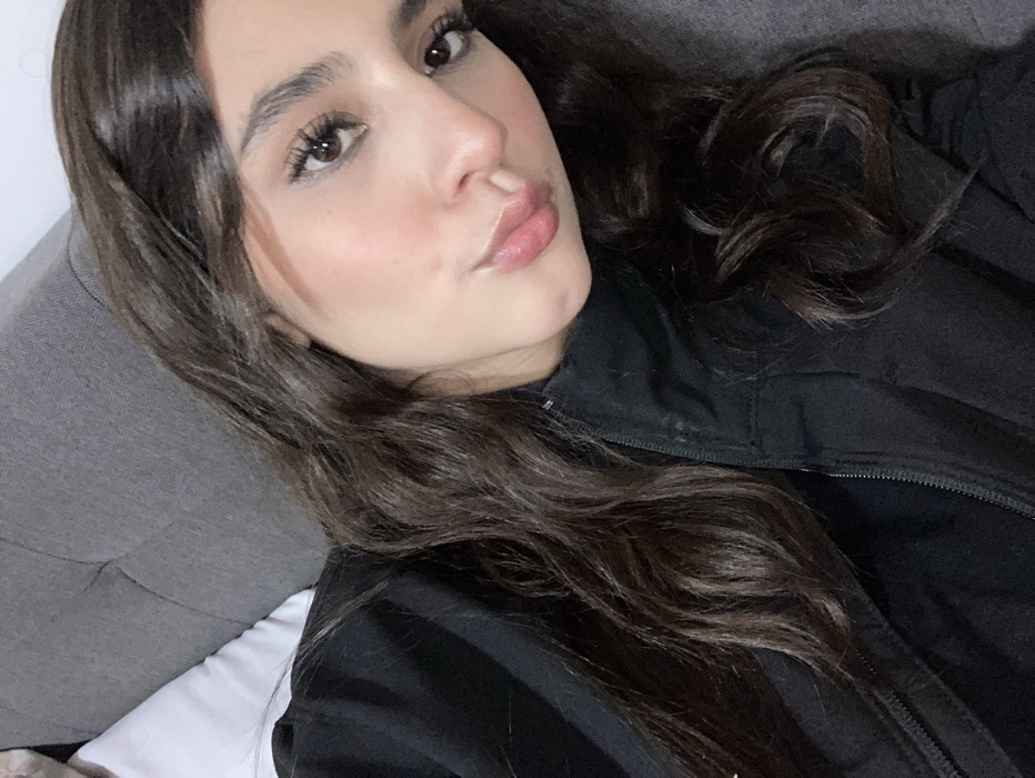 A close-up, high-angle selfie depicts a young adult female with long, dark brown, wavy hair cascading over her shoulders and chest