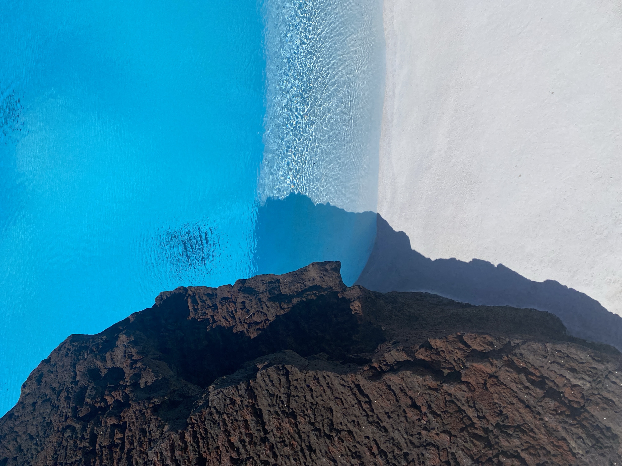 volcanic landscape of Lanzarote, specifically near Haría, Spain. In the foreground, dark, rugged volcanic rocks and cliffs are visible. Above, there is a clear, light blue swimming pool with gentle ripples on the water surface. Adjacent to the pool is a white, presumably concrete or stone, surface that may be a patio or a pool deck. The scene is shot from above, as if from a high vantage point. The angle is such that the edge of the pool aligns with the edge of the volcanic rock, creating a contrasting juxtaposition of nature and human construction. The lighting is bright and sunny, casting shadows from the rocks onto the surrounding surfaces.