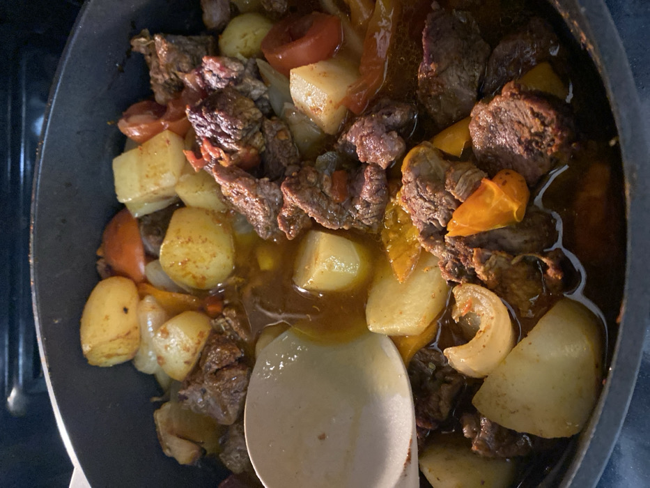 A top-down close-up depicts a dark cooking pot containing a meat and vegetable stew. The stew comprises irregular chunks of seared beef, cubed potatoes, sliced white onions, and pieces of red and orange bell peppers, all submerged in a rich, reddish-brown broth. A light, possibly wooden or plastic, serving spoon is partially immersed in the stew on the left side of the frame. The pot is positioned on a dark, indistinct surface, consistent with a stovetop burner. The image itself provides no visual identifiers to confirm a location in Netanya, Israel.