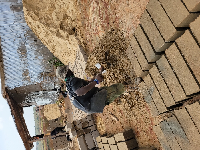 The image depicts an outdoor construction or brick-making site in Nwofia, Nigeria, under an overcast sky