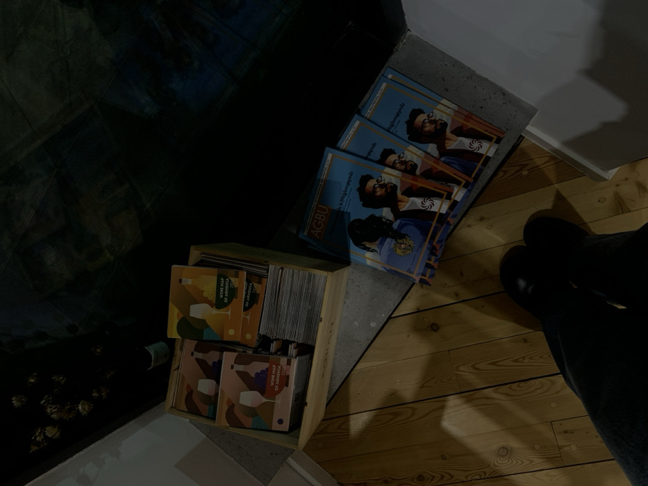 collection of printed materials. There are several copies of a magazine with a blue cover, featuring portraits of people, a logo labeled "AGBU" and Armenian text. Next to the magazines is a wooden box filled with small cards or brochures. The cover of these cards indicates "WINE MAP OF ARMENIA 2024". The lower right corner of the image includes a person's legs, clad in dark pants and shoes, standing on a wooden floor.