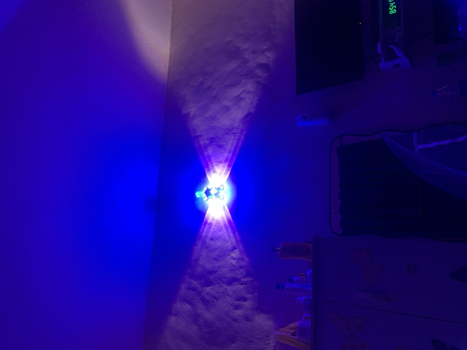 A vibrant blue light emanates from a fixture on a textured wall, creating a striking hourglass pattern. The light illuminates the wall, highlighting its uneven surface. To the right, a dresser with toys and a covered bed are visible. Above the bed, a dark television screen is mounted. The overall ambiance is dark and dominated by the intense blue hue.