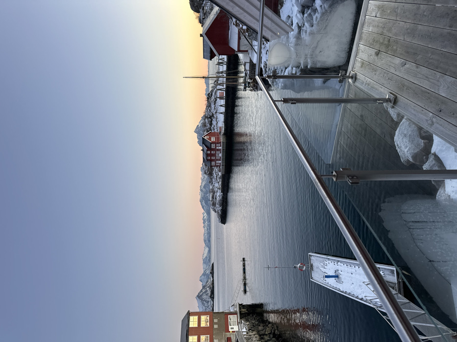 The image presents a panoramic view of a winter coastal scene in Stamsund, Norway, observed from a wooden deck featuring a glass and stainless steel railing in the foreground