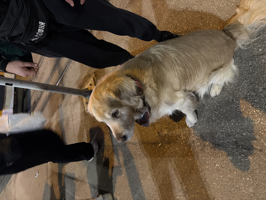 The image depicts an urban street scene at night or late evening in Sofia, Bulgaria, characterized by artificial lighting. A light-coated Golden Retriever dog is the central subject, seated on a pavement surface, facing left with its head slightly elevated. The dog wears a patterned red and dark-colored bandana over its collar. Its fur appears well-groomed, with longer hair on its tail and underside. To the right of the dog, the lower body of a person is visible, standing still. This individual wears black athletic trousers and dark footwear. A black fanny pack, bearing the white Cyrillic text "СОФИЯ" (Sofia), is secured around their waist. A partial view of a hand is seen at the upper right. On the far left, the lower legs and feet of another person are visible and partially blurred, indicating motion as they appear to be walking past. This person wears dark trousers and light-colored shoes. The ground consists of pavement, appearing wet or reflective in areas, exhibiting shades of grey and brown. A single cigarette butt is present on the pavement near the dog's left front paw. In the background, two parallel tram tracks are discernible on the road surface. A grey metal pole, consistent with street furniture, stands vertically behind the dog and the stationary person. Distinct shadows are cast on the pavement by the individuals and the pole, indicating a prominent artificial light source.