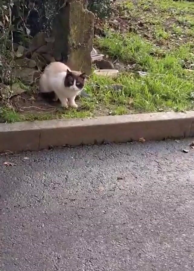 tan and white cat sitting at the edge of a patch of grass. Behind the cat is a green ivy-covered wall, as well as a small, gray pillar. To the cat's right is a concrete curb that borders the grass. In front of the cat is an asphalt surface, which appears to be a road or sidewalk. Beyond the grass and across the road, is another grassy area, as well as a multi-story building. The day is sunny and the cat is sitting still, looking around.