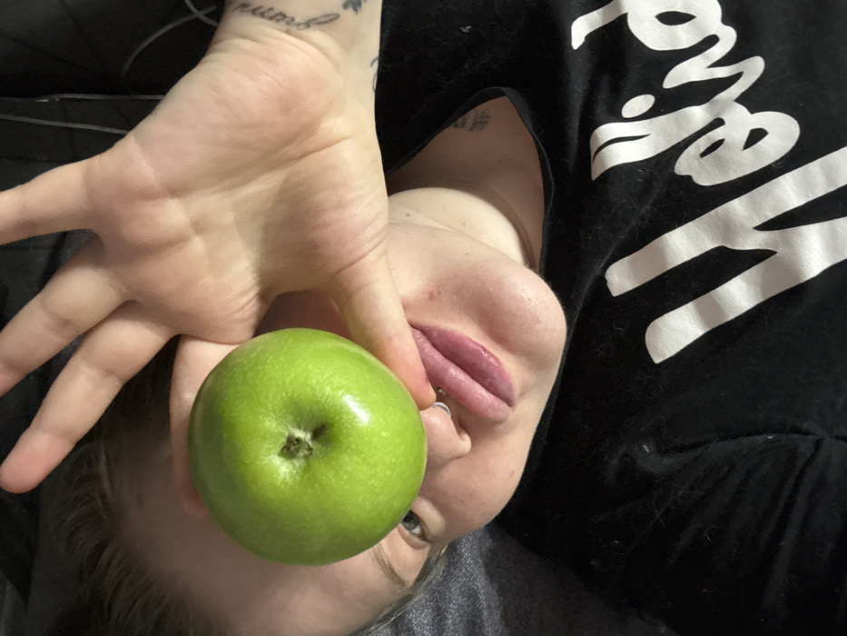 A person lying down holds a green apple in front of their face