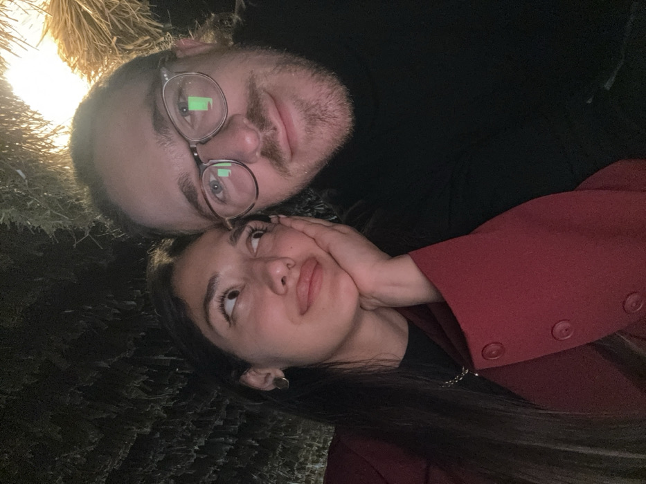 A selfie-style shot of a man and woman embracing. The man, wearing glasses and a dark top, is positioned above the woman. She gazes upwards, gently holding her face with one hand. She wears a red jacket over a black shirt. The photo is taken at an angle, making the couple appear as if they are lying down, with a blurry, dark background that includes some bright, blurred areas that may be light sources.