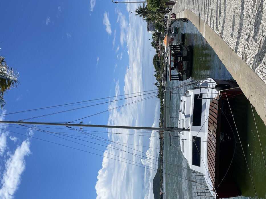 The image depicts a daytime waterfront scene in Cabo Frio, Brazil. In the foreground, a white and dark-hulled catamaran, equipped with a central mast and extensive rigging, is prominently docked parallel to a patterned cobblestone promenade. The catamaran's bow features a wooden deck surface. To the right of the catamaran, several other vessels are moored in the calm, greenish water, including a brown wooden boat with an open cabin structure and a partially visible white and orange boat further along the quay. The promenade, which runs along the right side of the image, exhibits a distinct pattern of dark geometric shapes set into a lighter surface. A few individuals are visible in the mid-distance, seated or standing on this promenade. Across the water on the left, vegetated hills rise in the background. The right side of the waterway is bordered by urban development, featuring multi-story buildings, numerous palm trees, and streetlights. The sky above is largely clear blue, interspersed with scattered white cumulus clouds.