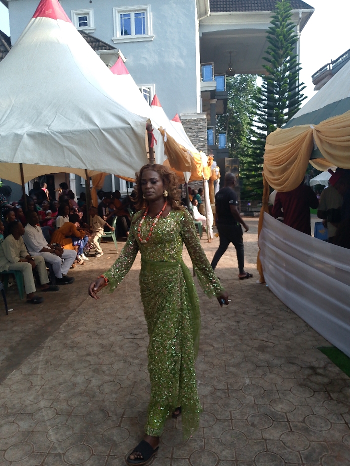 A woman in a green, long-sleeved, sequined dress and sandals walks on a tiled surface, flanked by white and beige tents. Guests are seated under one tent, while a person in black passes behind her. In the background stands a multi-story building with a tall evergreen tree between it and the adjacent tent. The woman wears a coral necklace and earrings.