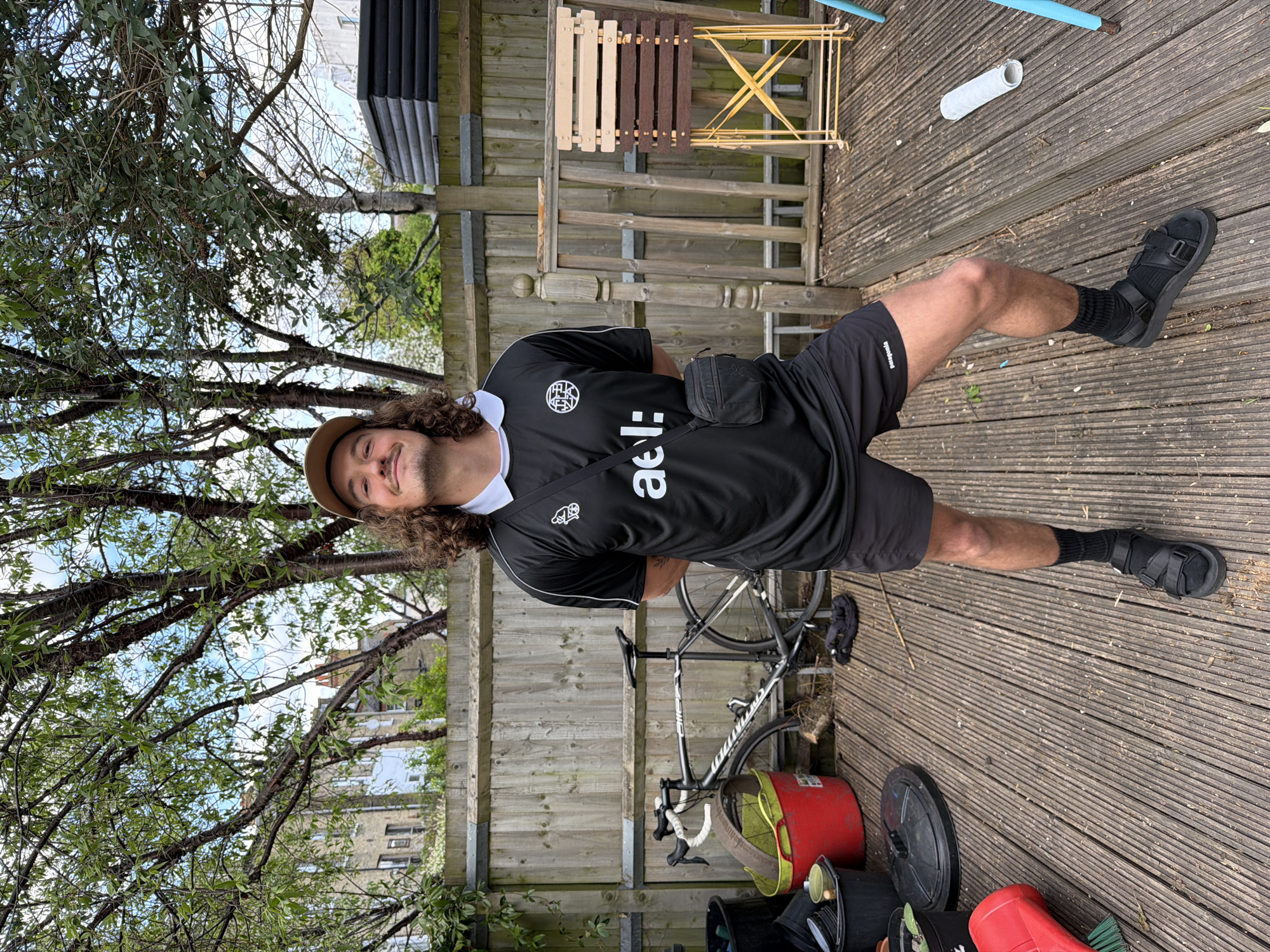 A full body shot shows a man standing on a wooden deck in a backyard in London, UK. He has curly, shoulder-length brown hair and a brown hat. He wears a black short-sleeved soccer jersey with the word "ael:" in white on the front, black shorts, black socks, and black sandals. A small black bag hangs across his chest. Behind him is a bicycle leaning against a wooden fence. The deck is surrounded by trees and plants. Garden items such as buckets, a red watering can and a laundry drying rack are scattered around the bike.