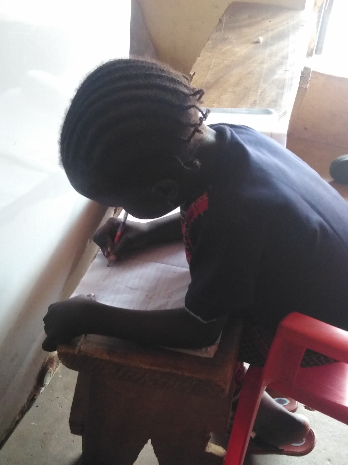 In Television, Nigeria, a child is seated indoors, viewed in profile from the left, actively writing