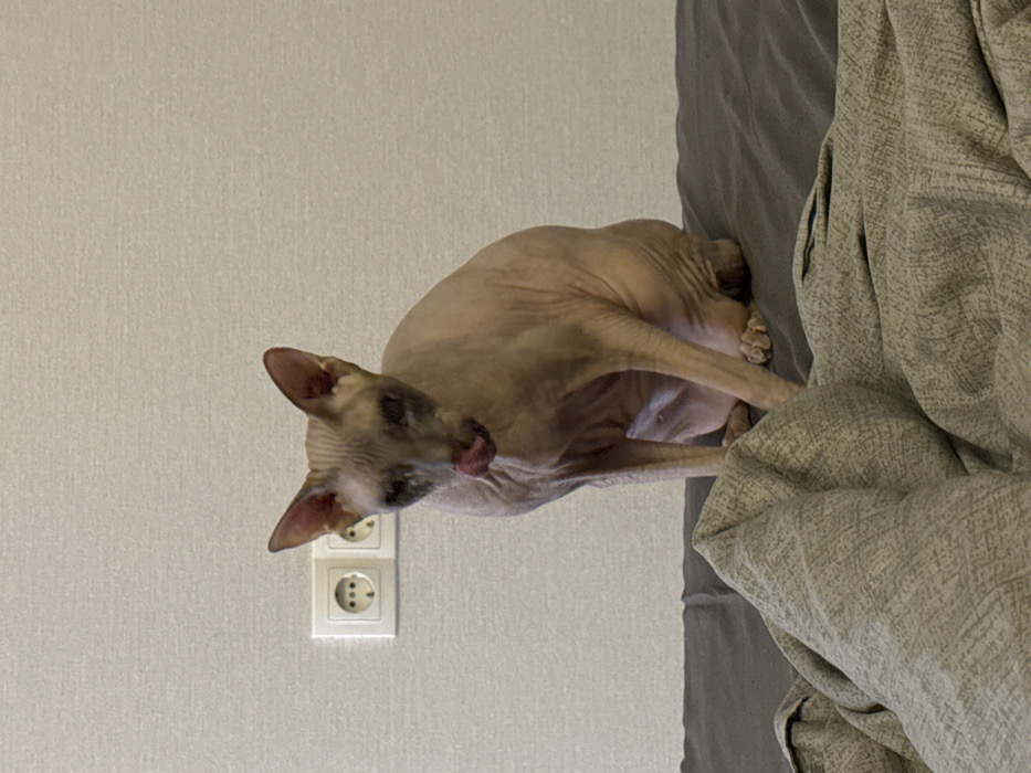 - "A hairless Sphynx cat, displaying a pale pinkish-beige body with a distinct bluish-grey coloration on its face, ears, and paws, is observed sitting upright on a dark grey fabric surface, consistent with bedding, within an indoor setting" by FM-v8Wu72, licensed under CC BY 4.0