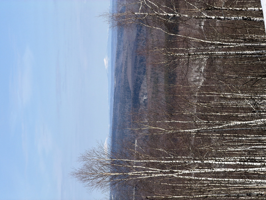 This image captures a panoramic winter or early spring landscape located in Gubakha, Russia. The immediate foreground is filled with a dense stand of bare birch trees, characterized by their vertical white trunks and intricate dark, leafless branches. The ground beneath these trees, particularly in the lower right, shows patches of snow. Beyond the foreground birches, the midground consists of a vast, undulating expanse of dense forest, primarily composed of dark-toned coniferous and deciduous trees without leaves. Scattered lighter areas within this forest indicate minimal snow cover or cleared ground. A faint, winding light-colored line, consistent with a path or road, is visible within the midground forest toward the left. In the distant background, several mountain ranges are present, with two distinct peaks exhibiting visible snow caps. The sky above is clear and light blue, with faint, wispy cloud formations. No people, objects other than natural elements, or discernible actions are present. The scene is illuminated by bright, natural daylight.