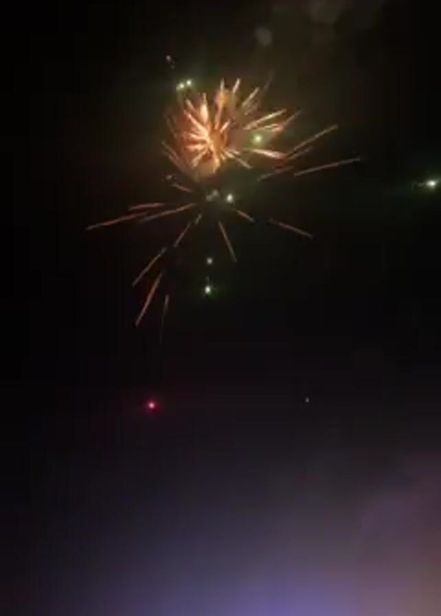nighttime fireworks display. The fireworks explode in bursts of red, green, and gold. The sky is dark, and the fireworks provide the only light. A row of objects that could be building structures can be seen in the bottom of the video.