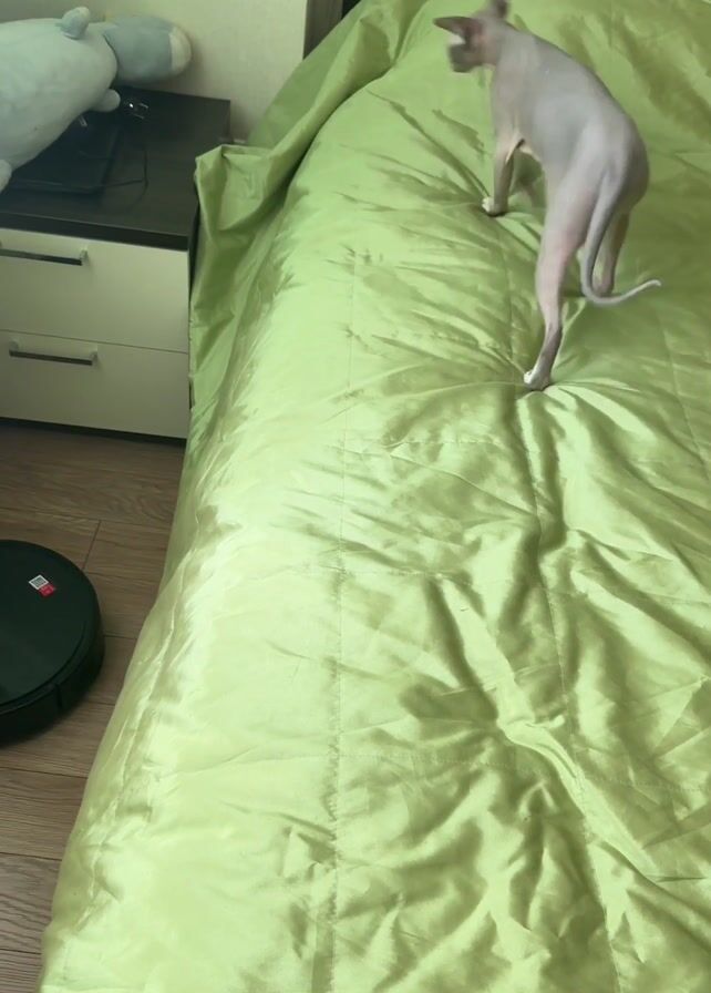 - ". A hairless cat walks across a bed with a light green, shiny bedspread towards a bedside table with two drawers. A gray stuffed animal is on the table. The cat steps onto the table, then looks at the floor before stepping down. A black robotic vacuum cleaner is on the wooden floor next to the bed. A sheer green curtain hangs next to the table." by FM-zBr6u2, licensed under CC BY 4.0