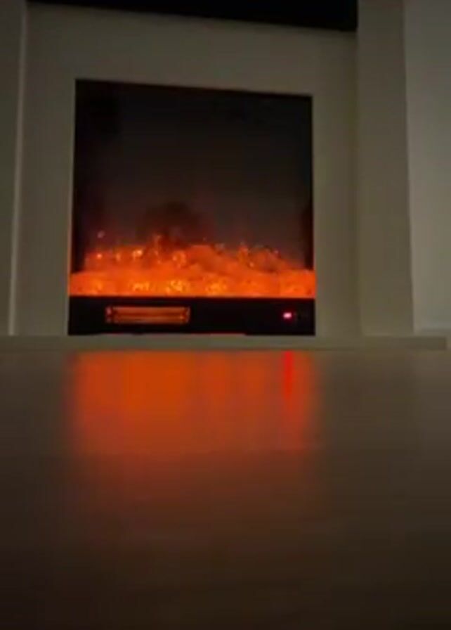 The camera is positioned at ground level and faces a white electric fireplace insert with a black frame