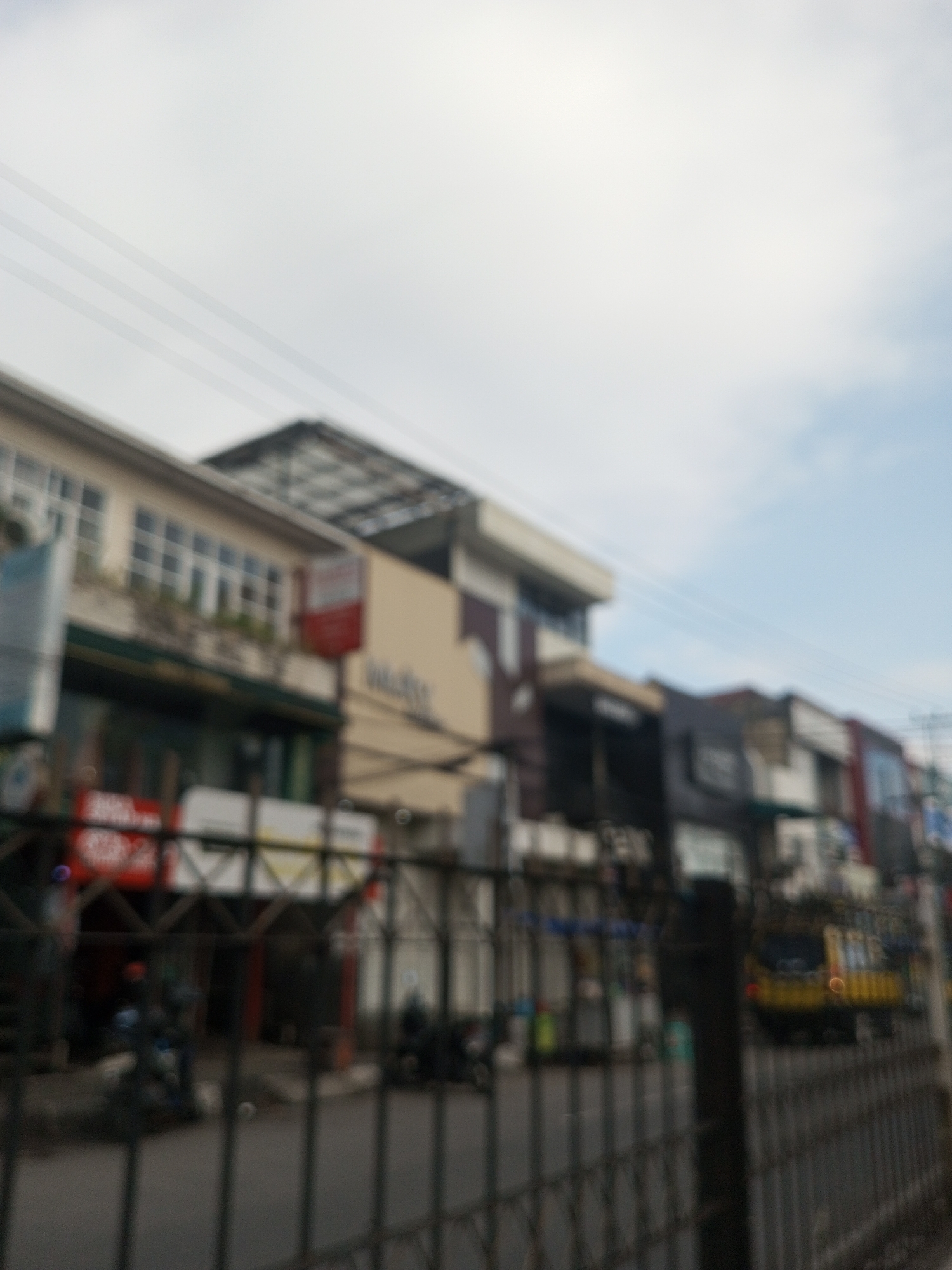 blurred street scene in Mya Sit Kaing Ywar Thit, Myanmar, viewed through a dark metal fence