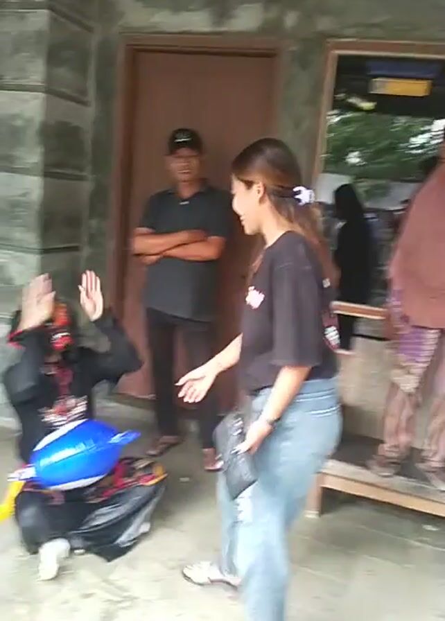 A low-angle, slightly out-of-focus shot shows four people and a character wearing a blue mask. The mask is round with two white eyes. The character wearing the mask is kneeling on a gray tiled floor. A black backpack sits beside them. A person wearing a black t-shirt and jeans is touching the masked character. Standing behind the masked character is a man wearing a black baseball cap, black t-shirt, and black pants with his arms crossed. The background features a brown door and a wall with gray tiling. Another person is lying down near the bottom of the frame.
