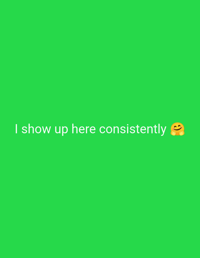 The image is a static digital graphic featuring a uniform solid green background. Centered horizontally in the lower middle section of the frame is white sans-serif text that reads "I show up here consistently". Immediately to the right of the text, a yellow hugging face emoji (🤗) is displayed. No people, physical objects, actions, or environmental details of a specific location in Lhokseumawe, Indonesia, or any other city are discernible. The scene exclusively comprises text and an emoji on a color field.