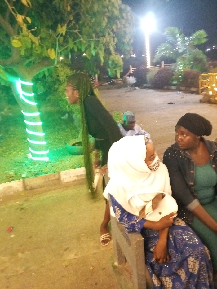 At night, a group of four people are sitting together. A woman with braids stands by a tree wrapped with green lights. A woman wearing a white headscarf and blue patterned dress sits on a bench. Next to her is a woman in a black beanie, denim jacket, and green top. In the background, a man in a white cap sits further away. The area appears to be a public space with lighting and greenery.
