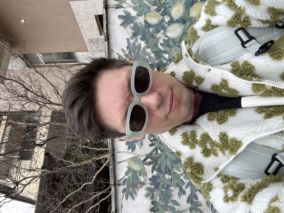 A male individual with short dark hair and light skin is captured in a selfie-style shot in Boreti, Montenegro. He is wearing light blue, rectangular-framed sunglasses with dark lenses and a white fleece jacket patterned with olive green abstract shapes. A dark shirt, possibly maroon or black, is visible underneath. A portion of a white cane is visible vertically against his chest, and a light grey sling bag strap with a black buckle crosses his right shoulder. He is looking directly at the camera with a subtle smile. Behind him is a wall painted with a mural depicting green leaves and light green/yellow fruits, resembling lemons or limes. Above the wall, bare deciduous trees are visible, and in the further background, building structures with light brown and grey facades are present under what appears to be an overcast sky.