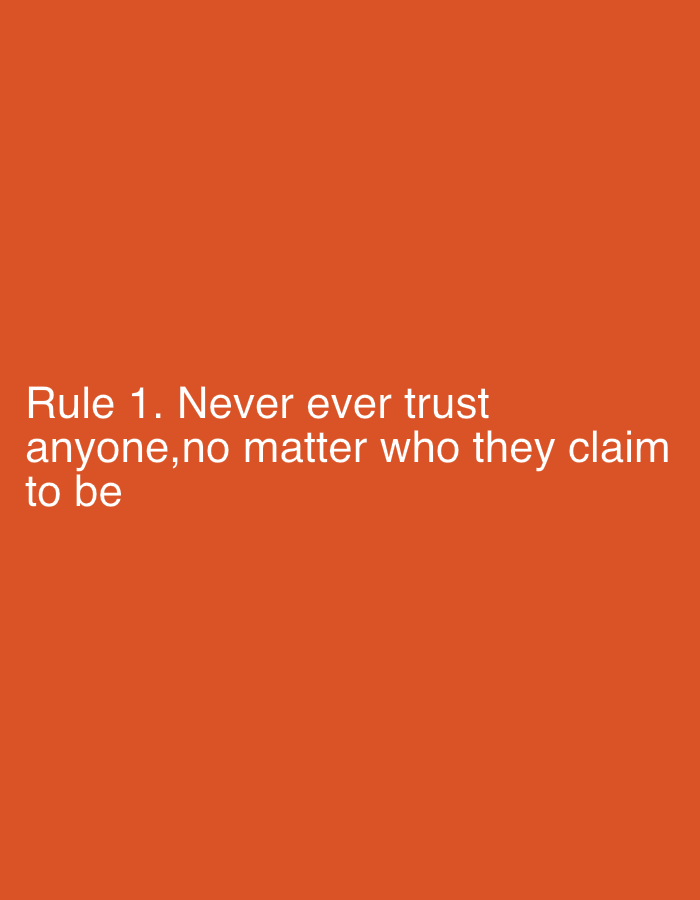 solid reddish-orange background. White text is centered towards the bottom of the image. The text reads: "Rule 1. Never ever trust anyone, no matter who they claim to be." The font appears to be plain and sans-serif.