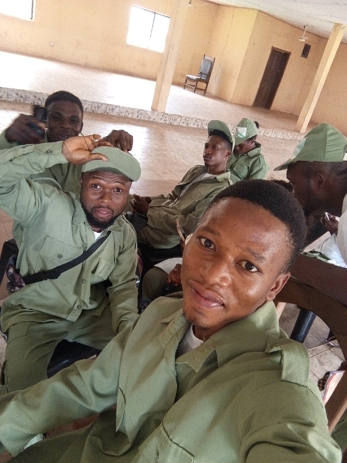 This image depicts a group of at least seven individuals, predominantly male, gathered indoors in what appears to be a large hall or common room in Unknown, Unknown. All visible persons are young adults of African descent, uniformly dressed in olive-green long-sleeved shirts with pockets, matching trousers, and green caps. The individual closest to the camera, a male with short dark hair, is positioned in the foreground, facing directly forward with a slight smile, indicating a selfie perspective. To his left (viewer's right), another male with a beard is partially visible, wearing a green cap and raising his right hand towards it while looking at the camera. Behind these two, a third male is holding a black smartphone, possibly also capturing the scene. Further in the background, additional individuals in identical uniforms are seated or standing; one male is seated, looking to the side, and a female is partially obscured, looking downwards. The room features pale beige walls, a light-colored tiled floor, and natural light entering from a multi-paned window on the left. A single dark wooden chair and a dark wooden door are visible against the far wall in the background.