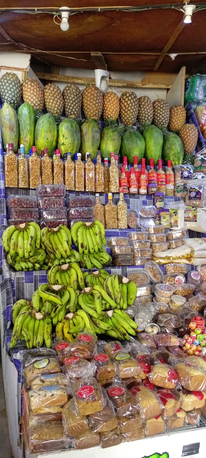 The image displays a densely stocked market stall in Aviation Quarters, Nigeria