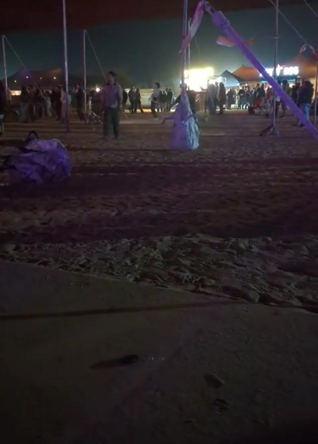 A wide, low-angle shot shows a nighttime beach scene. Above, a large, dark awning is supported by metal poles with colorful ribbons. The ground is sand, with scattered debris. Several people are walking around and milling about. In the background, a crowd is gathered near illuminated structures. A person walks by the camera in the foreground. The lighting is dim, but highlights the sand and people in the middle ground.