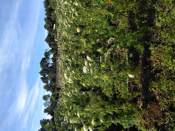 The image depicts an outdoor agricultural scene, likely a cultivated field, located in Ciherang, Indonesia, under a clear blue sky with scattered white cirrus clouds. The midground is dominated by a dense stand of green herbaceous plants, approximately 1-1.5 meters tall, characterized by feathery foliage and numerous clusters of small white flowers arranged in compound umbels. Many individual plants are supported by slender vertical wooden stakes. The foreground consists of dark brown soil with sparse green ground cover and small weeds. In the background, a dense line of various trees, including both coniferous and broadleaf types, forms a natural border. A small, dark-roofed structure is partially visible within the tree line on the left, and a lighter-colored structure is faintly visible further right. A simple fence line or row of posts appears to separate the cultivated field from the distant tree line. The scene is illuminated by direct sunlight. No individuals or animate subjects are visible.