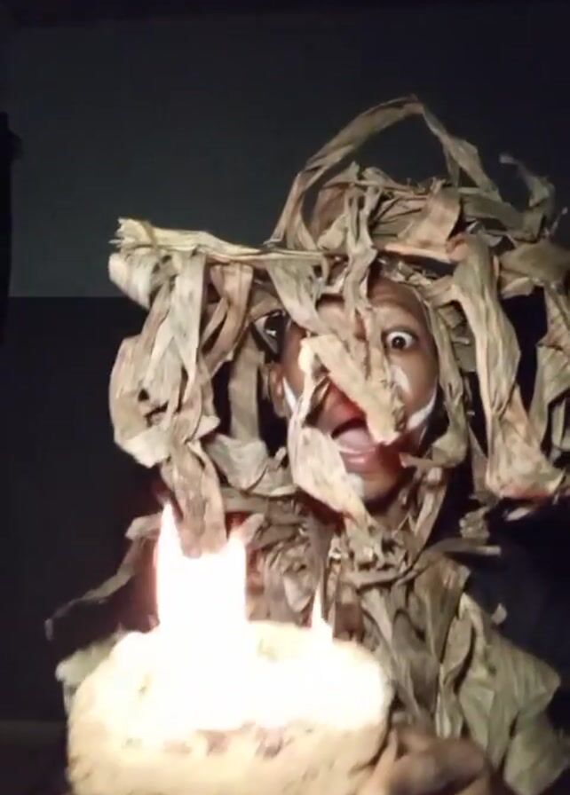 A person dressed in dried leaves, with white paint on their face, is holding a flaming object in their hands. The person's mouth is open in what appears to be a shout or scream. The background is dark, with a wall visible. The lighting is poor, with the fire providing the main source of illumination.