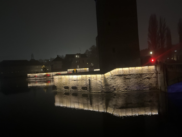 The image displays a nighttime view of the Ponts Couverts in Strasbourg, France