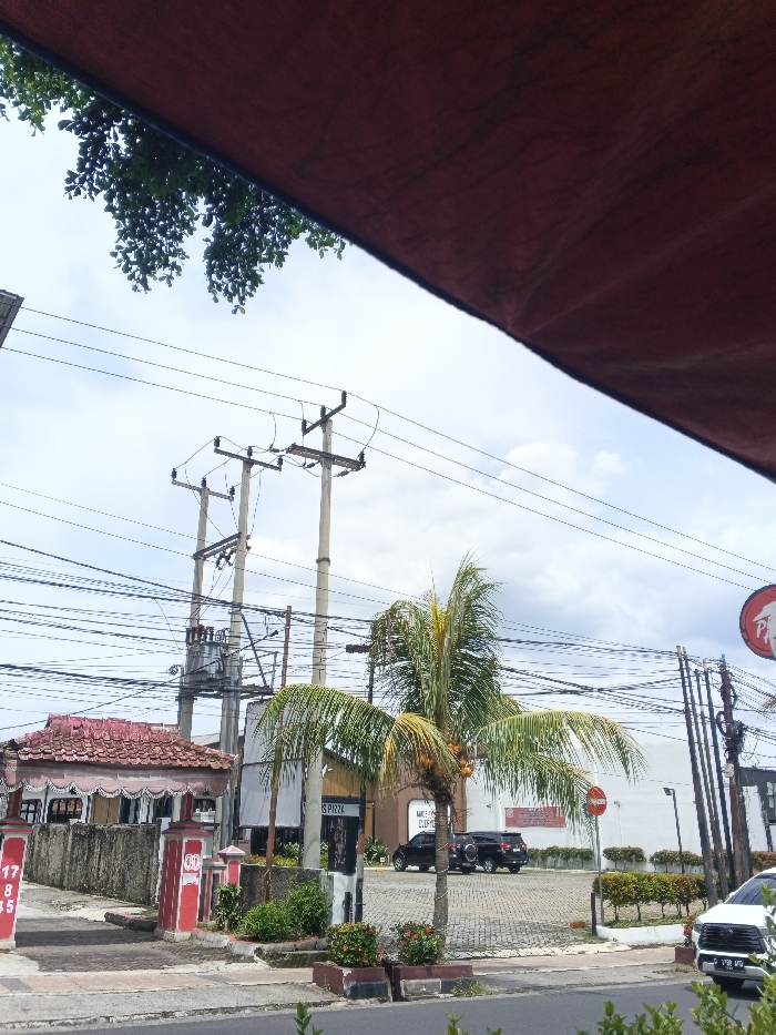 A street scene features utility poles and wires against a cloudy sky. A palm tree stands in front of a building with parked cars. The building seems like a business. There is a partial view of the red roof of another building. The foreground includes a sidewalk and greenery, and the top of the frame is partially obscured by the bottom of trees and a red awning.